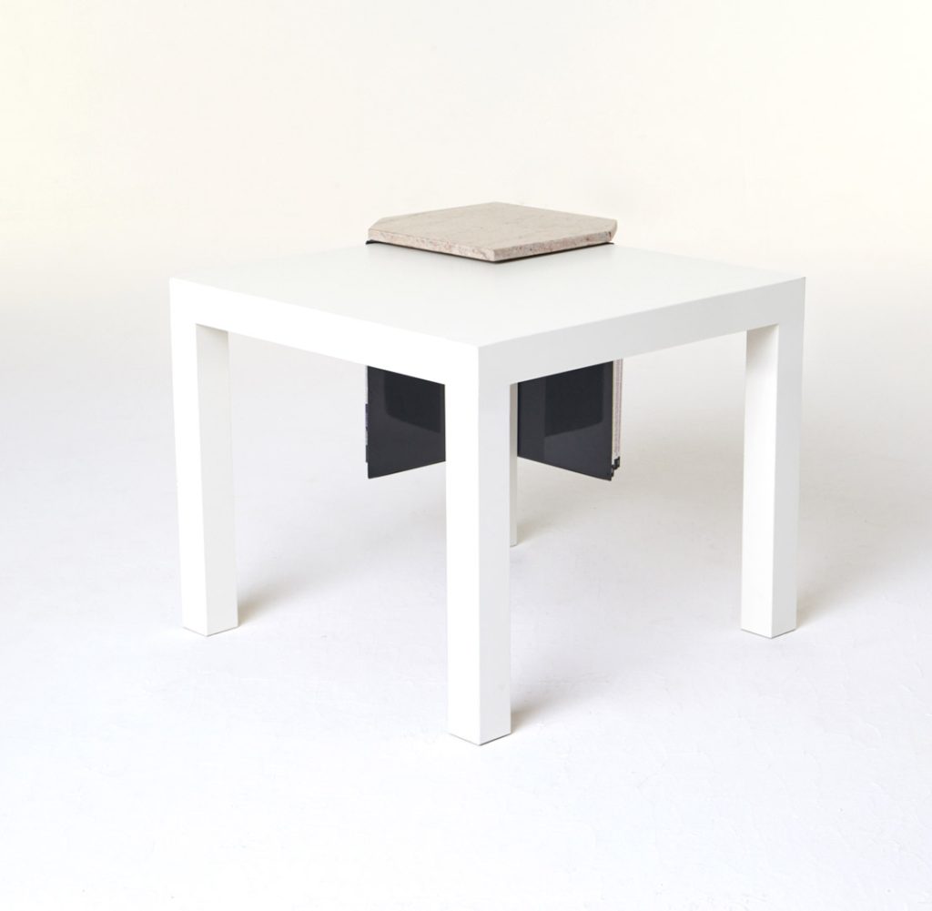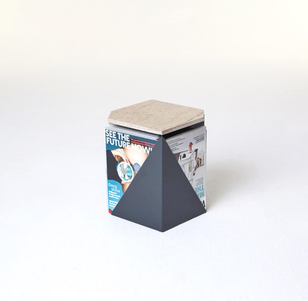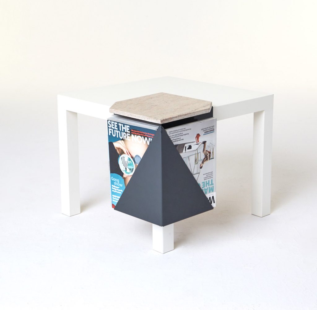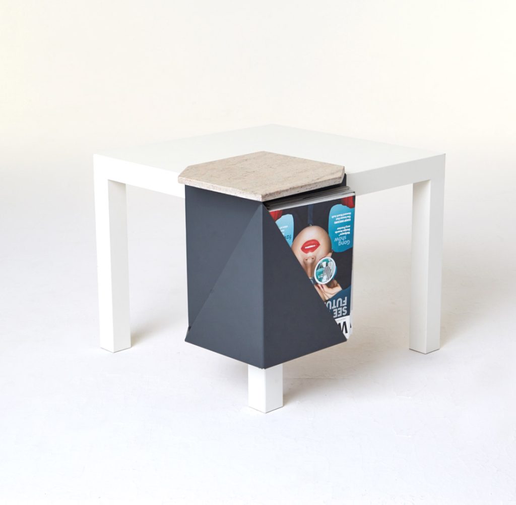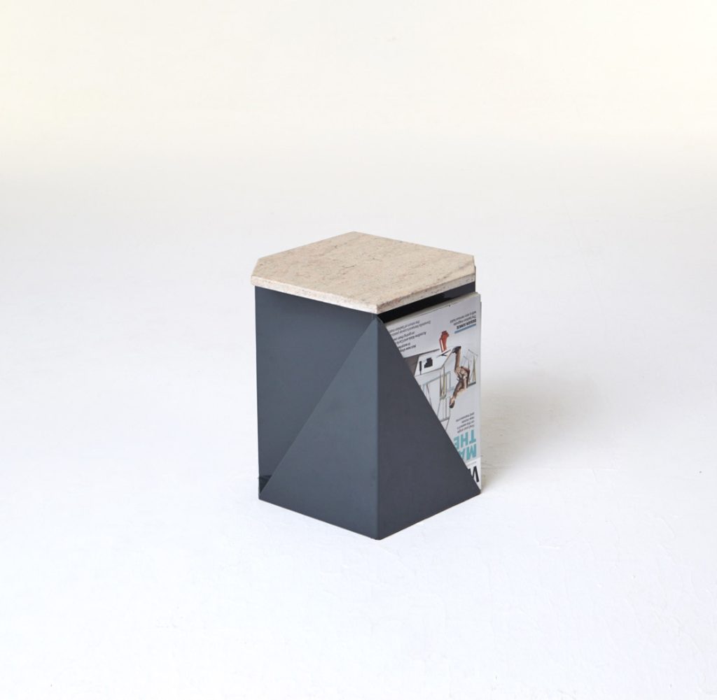 The magazine table is made from thin steel and stone, which can function both as a stand-alone or as an element of a different piece of furniture, thus managing to economise on space. Polypore may also employ the presence of other objects – through attachment – for its own function within a given space. On other occasions, it may constitute an autonomous piece of furniture, occupying its own place within the flat.