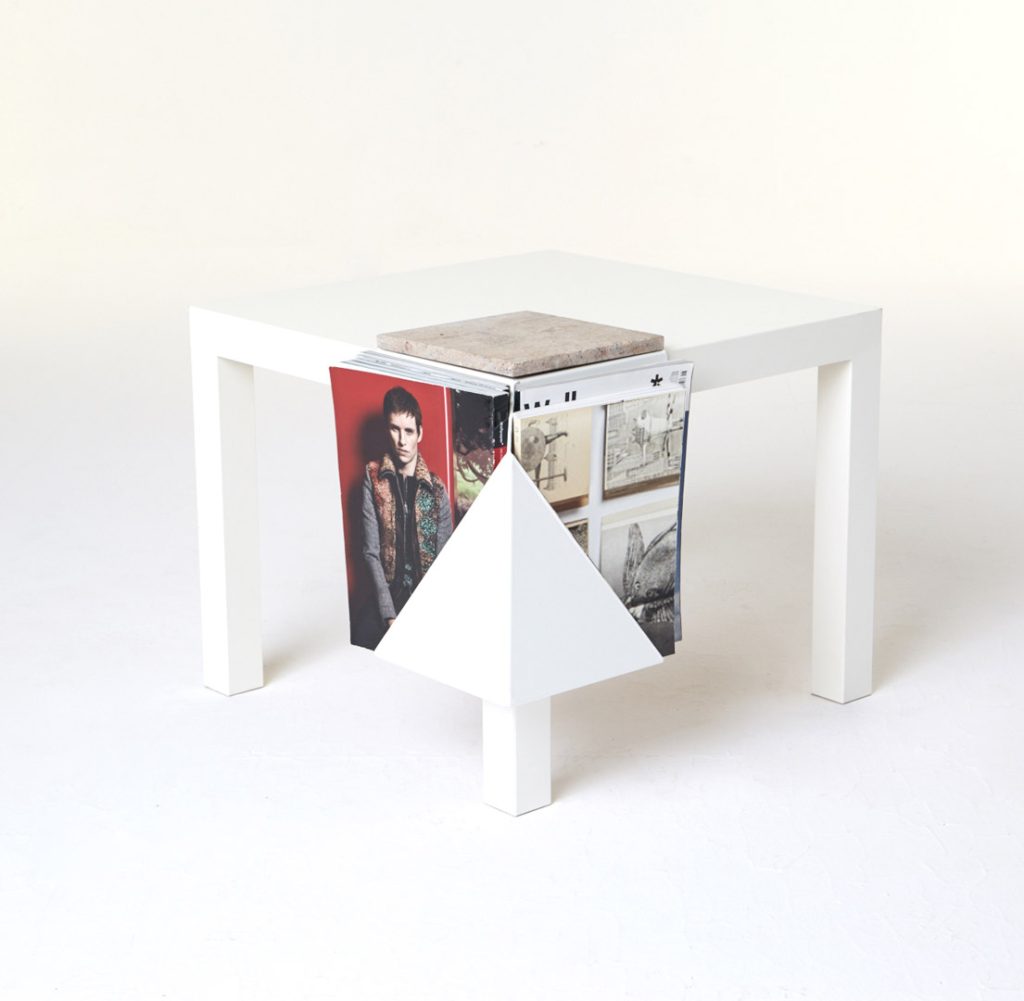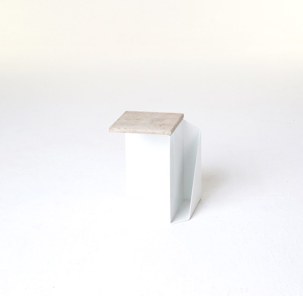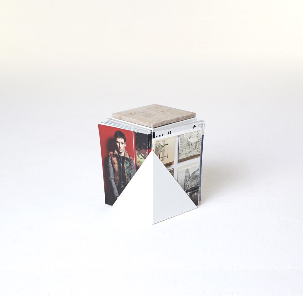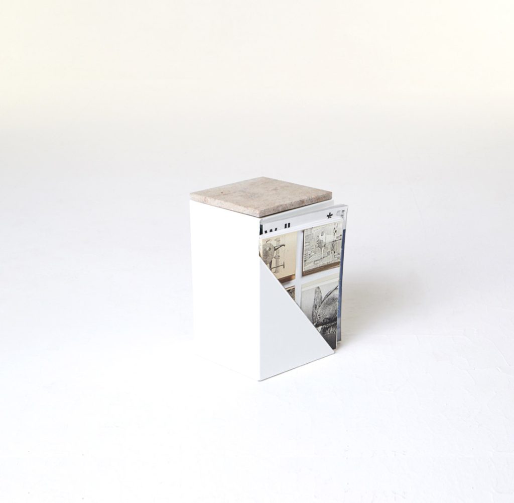 The magazine table is made from thin steel and stone, which can function both as a stand-alone or as an element of a different piece of furniture, thus managing to economise on space. Polypore may also employ the presence of other objects – through attachment – for its own function within a given space. On other occasions, it may constitute an autonomous piece of furniture, occupying its own place within the flat.